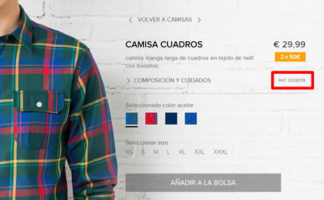 Si la talla o color que buscas no está disponible en la tienda online, puedes intentar conseguirla en cualquiera de nuestras tiendas Springfield de España. Simplemente apunta el número de referencia que aparece al final de la descripción en la ficha del producto. Con estos 7 números y el color y talla podrás pedirle al personal de nuestras tiendas que te ayude a encontrar el artículo.